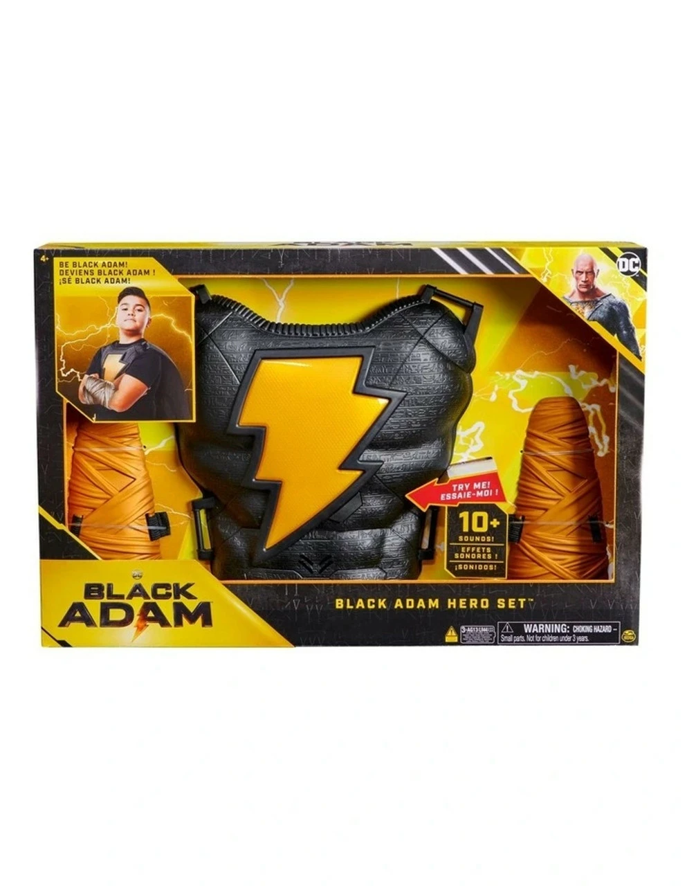 Transform into Black Adam with the Black Adam Hero Set! Put on the light-up chest plate (batteries included), golden gauntlets, and cape to become Black Adam. Press the chest button to activate lights and 10+ sounds. A must-have toy for Black Adam fans. For even more Black Adam fun, collect all the Black Adam figures, Black Adam, Hawkman, Dr. Fate, Atom Smasher and Cyclone (each sold separately). Collect them all and use your imagination to create your own Super Hero and Super Villain adventures. These official DC Comics Black Adam figures are a great girls’ and boys’ toys for kids to collect. Black Adam fans will love super hero toy figures and playsets, making them a great holiday, birthday, and celebratory gift! Bring the Black Adam action home with the Black Adam Hero Set!
