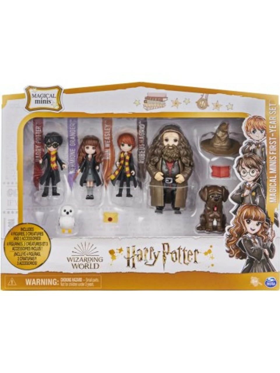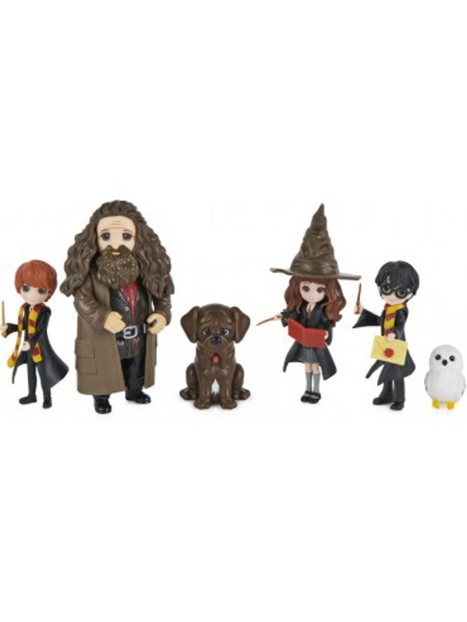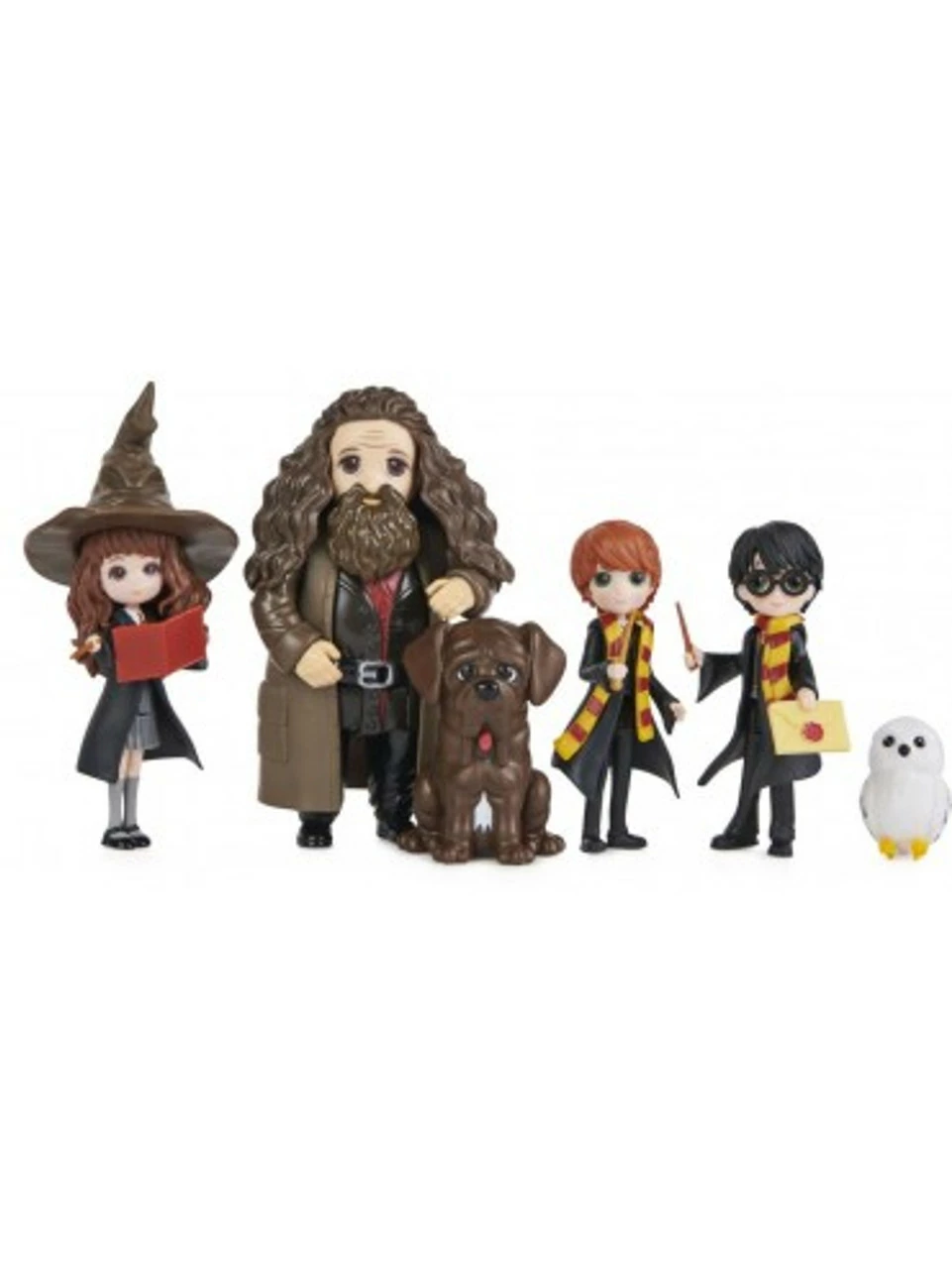 Recreate first-year at Hogwarts with your favourite Harry Potter characters and the Wizarding World Magical Minis First-Year Set! This set of Harry Potter dolls is a must-have for fans. It includes 3-inch Harry Potter, Hermione Granger, Ron Weasley and 4-inch Rubeus Hagrid dolls, plus three accessories, Hedwig, and Fang! Each doll is highly detailed, bringing the beloved Harry Potter characters to life. From the trio’s Hogwarts uniforms, to Hagrid’s coat and long hair, these Magical Minis Harry Potter collectibles are ready for endless spellbinding adventures! Place the Sorting Hat onto any of the figures and recreate the iconic Sorting Ceremony! With their true-to-character details, you can help Hedwig deliver important messages with the Hogwarts envelope and Fang can accompany your figures on every adventure. The Magical Minis First-Year Set is the perfect way to inspire your imagination through fun and exciting pretend play. For more ways to play, explore the halls of the Magical Minis Hogwarts Castle (sold separately) and collect all of the dolls, Friendship Sets and playsets (each sold separately) to build out your own Wizarding World! Magical Minis small dolls and the First-Year Set are great gifts for kids ages 5 and up. Relive first year at Hogwarts with the Wizarding World Magical Minis First-Year Set!