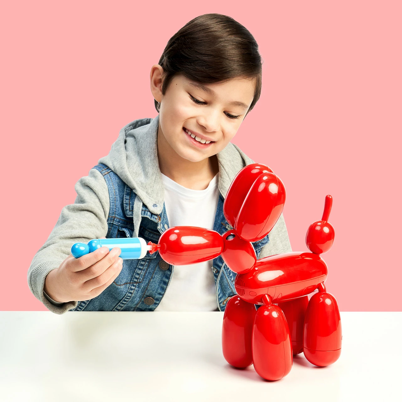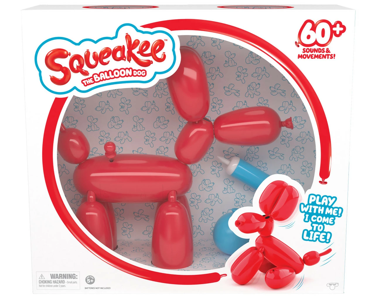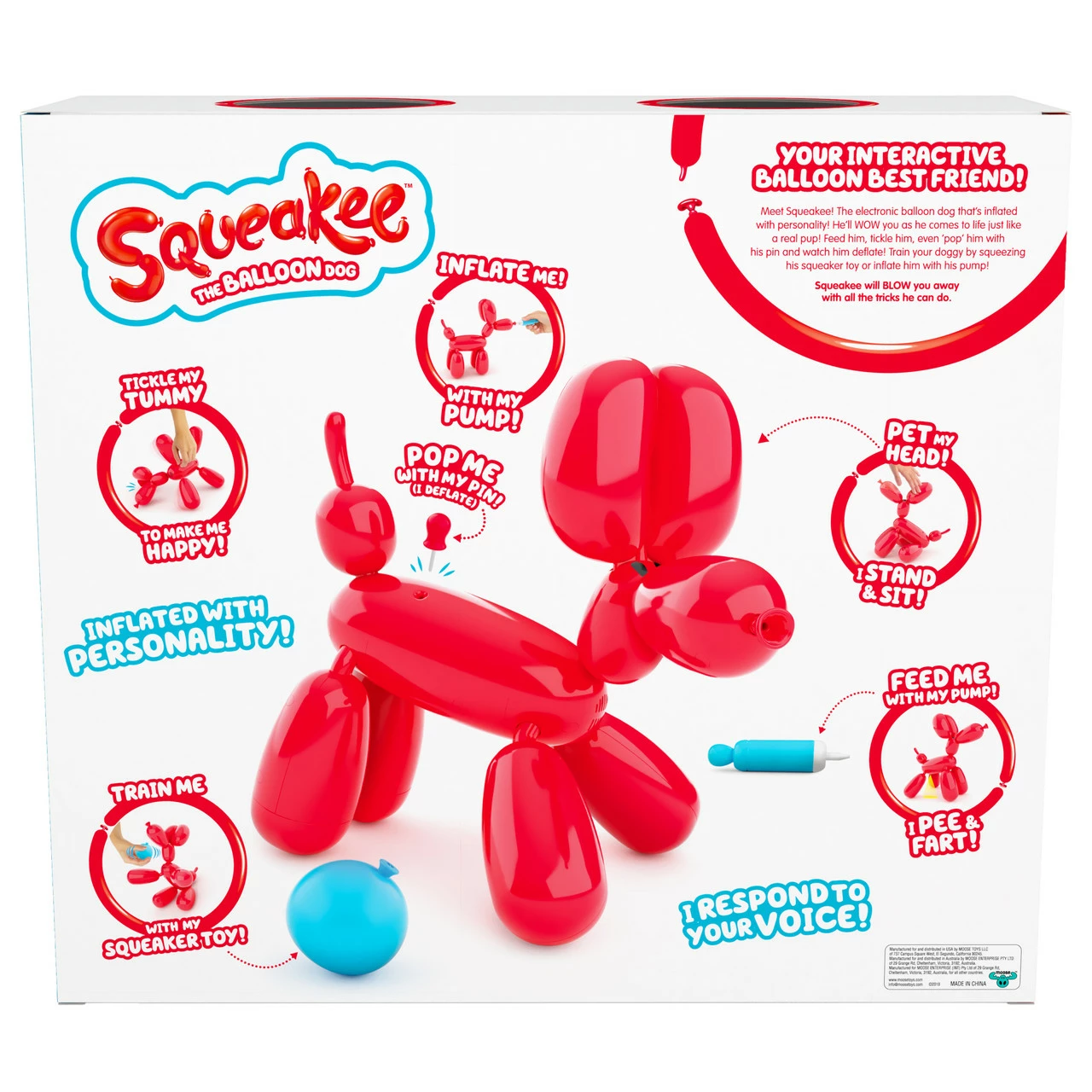 Meet Squeakee! The first ever balloon pet that’s inflated with personality! He’ll WOW you as he comes to life just like a real pup! Squeakee is so interactive and loves to play with you! This very playful toy responds to your voice, is full of sound and movement and looks just like a real Balloon Dog! Watch him sit and stand as you pet his head or tickle his tummy to make him happy! Squeakee comes with a range of fun accessories for you to interact and play with. Use his Pump to feed him. Place the Pump in his nose and hear him inflate! But be careful, when he’s full he may pee or fart! Squeakee loves his Squeaker Toy and gets very excited when he hears it! Use his Squeaker Toy to train him to sit or beg! Feed him, teach him, even “POP” him with his Pin and watch him deflate! You’ll be blown away at all his reactions and what he can do! Squeakee is your interactive balloon best friend!