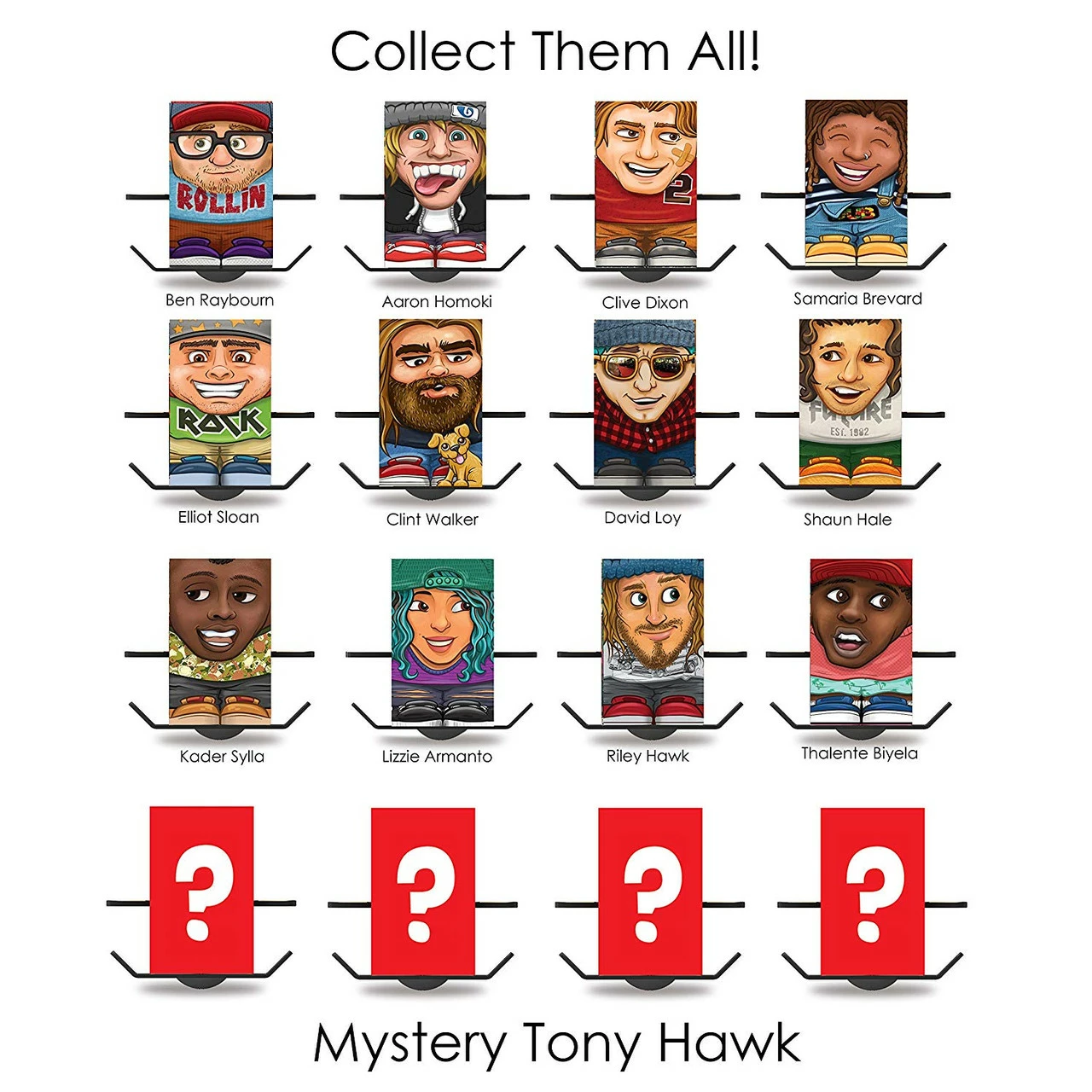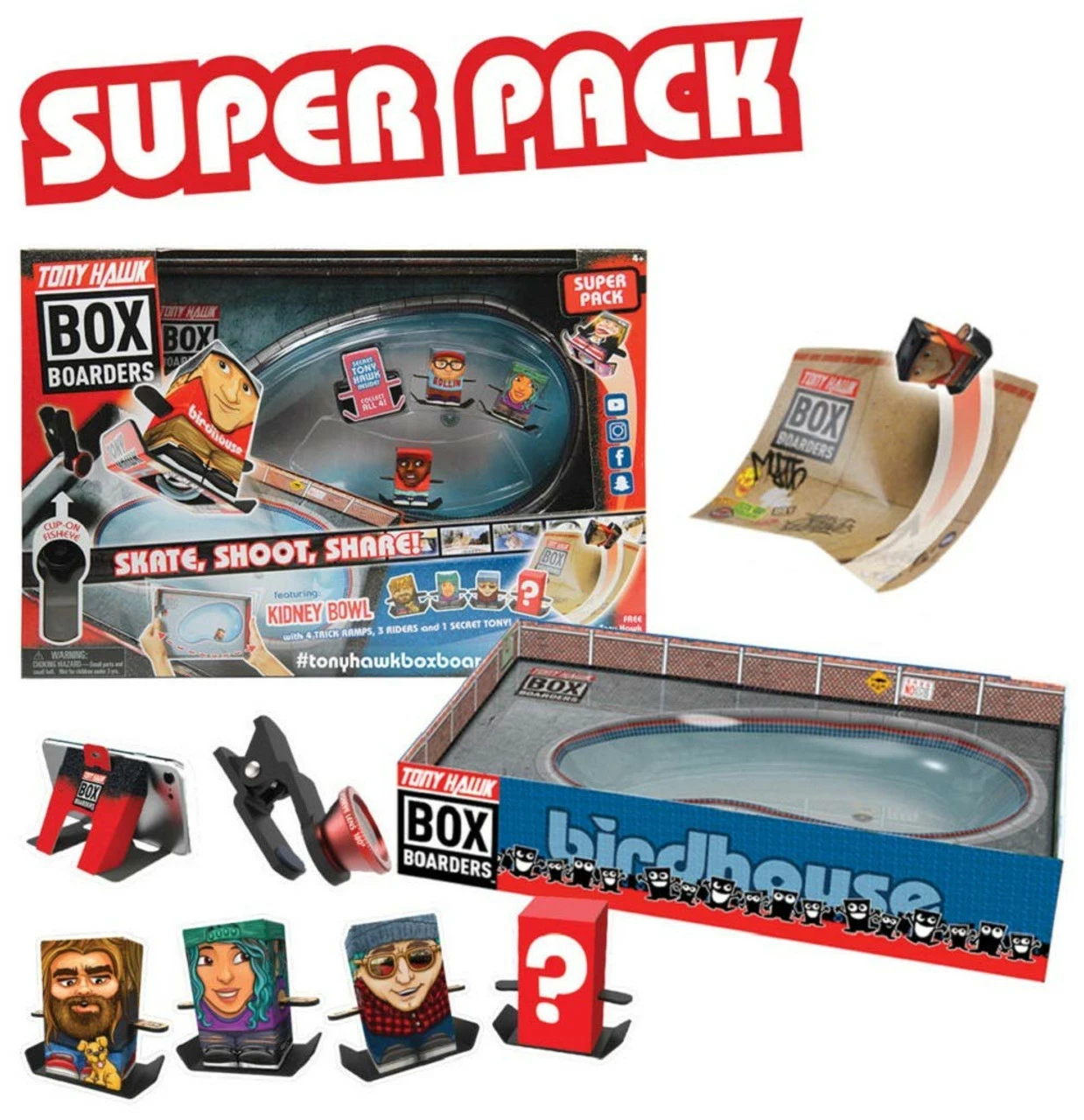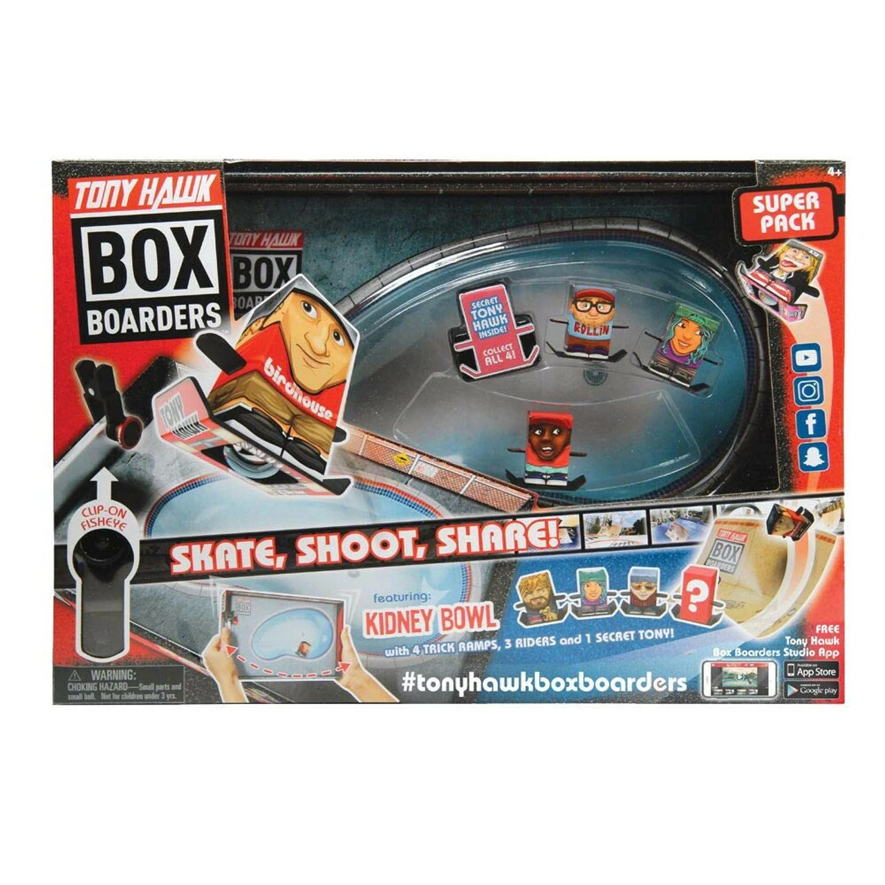 Skate, Shoot and Share with the Tony Hawk Box Boarders Super Pack Kidney Bowl with mystery Tony Hawk Figure! Collect Tony Hawk and all the Box Boarder skaters! Collect Tony Hawk and all the Box Boarder skaters! Each Super Pack set includes 1 Skate Bowl, 3 Assorted Skateboarders, 1 Mystery Tony Hawk Figure (collect all 4!), 4 Trick Ramps, 1 clip-on Fisheye Lens for smart phones and 1 Camera Holder! Create professional skate videos! Download the free Tony Hawk Box Boarders Studio phone app to record, edit and share all your favorite Box Boarder Kidney Bowl trick videos! Makes a great gift for kids and teens who love to skateboard and make home videos! Officially Licensed Hog Wild Toys Merchandise. Figures measure approximately: 1.5 x .75 x .6 inches. Ages 4 and up.
